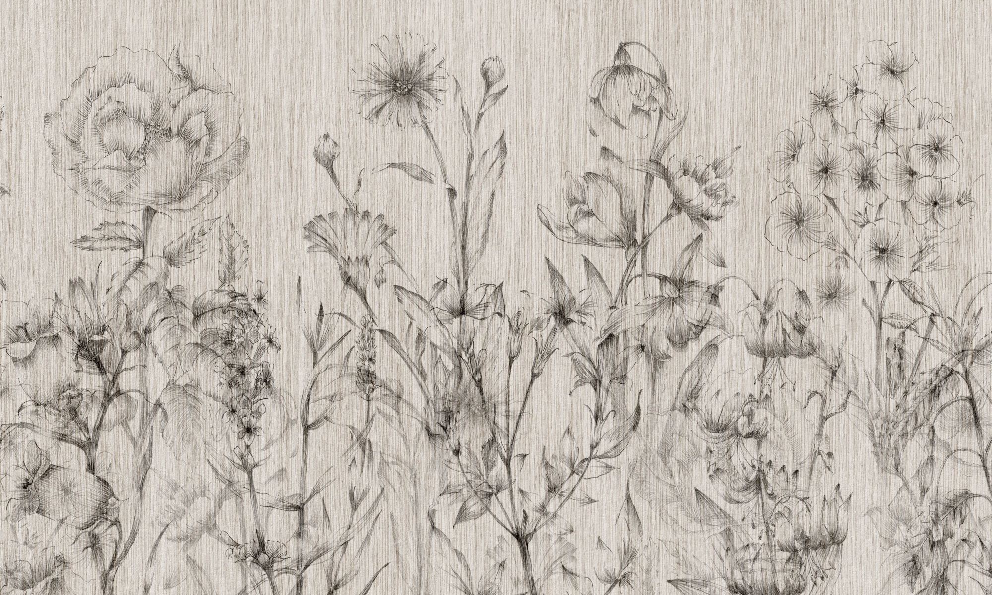 Delikatna tapeta ścienna w jasnobeżowych odcieniach z motywem kwiatów i traw narysowanych ołówkiem. Subtelna, artystyczna dekoracja, która wprowadza do wnętrz lekkość, spokój i naturalny urok.