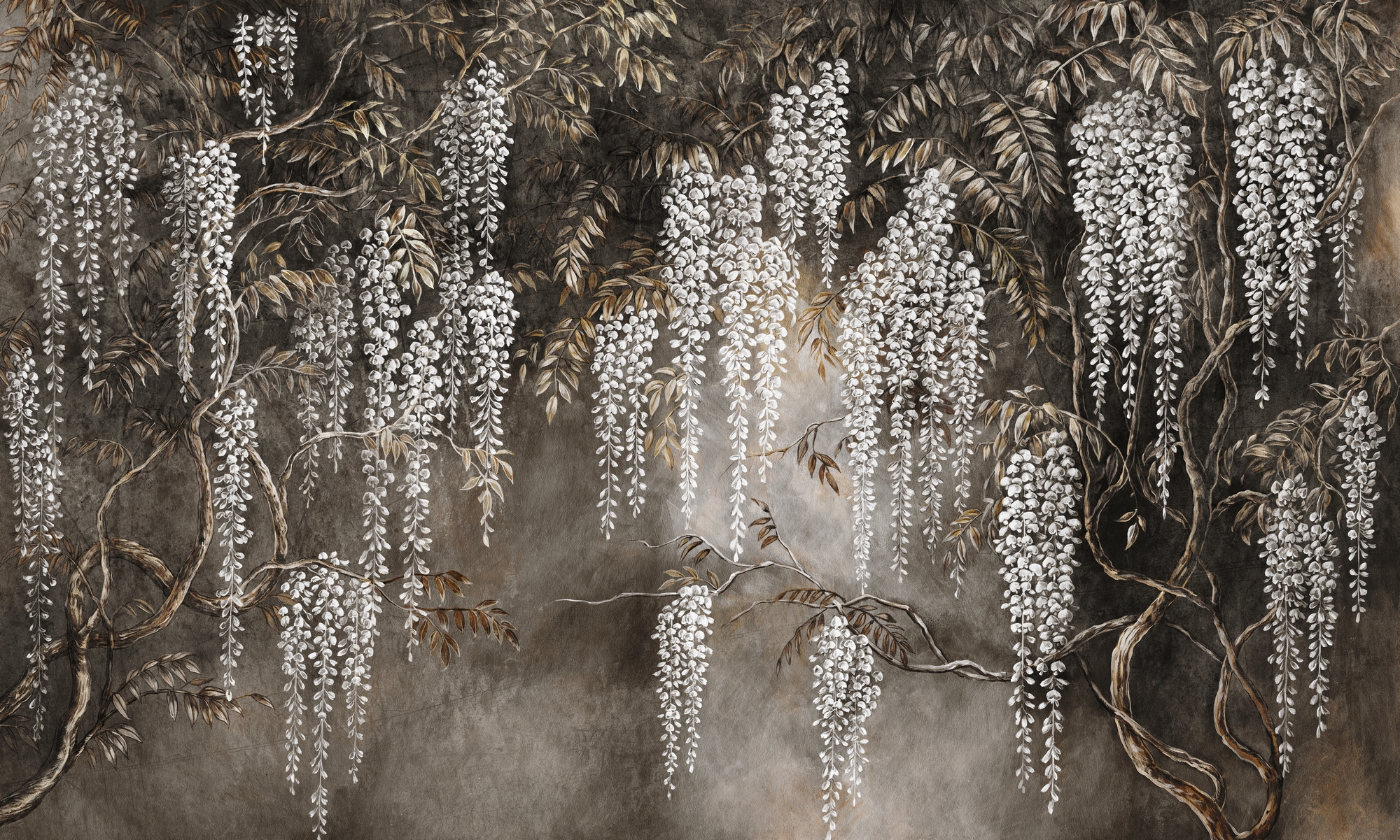 Tapeta ścienna w odcieniach brązu i złamanej bieli z motywem wisterii. Ciepła, elegancka kompozycja o delikatnym świetle dodaje wnętrzu szlachetności i głębi.