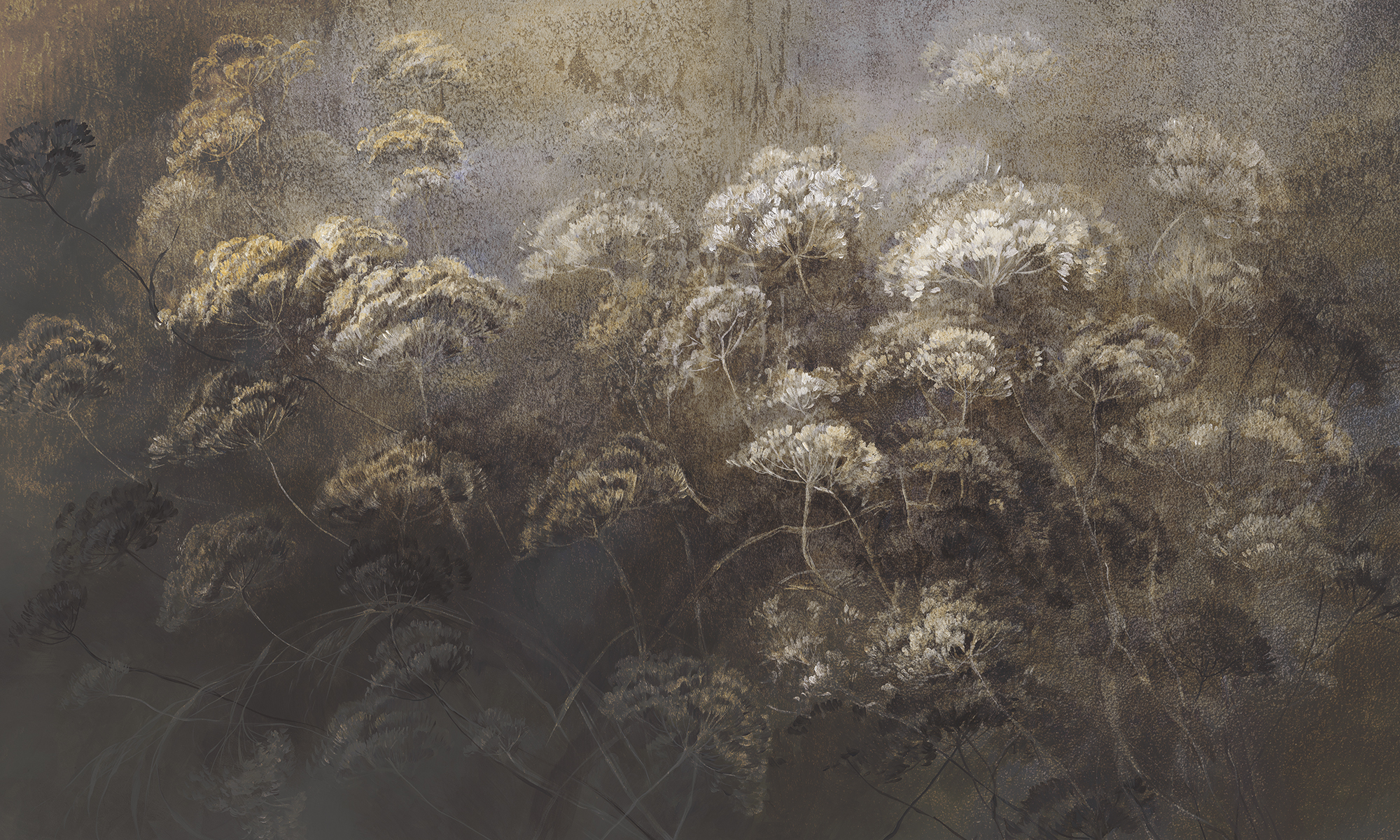Malarski motyw roślin w głębokich, ziemistych tonach. Subtelne światło i miękkie przejścia kolorów tworzą efekt spokoju i elegancji.