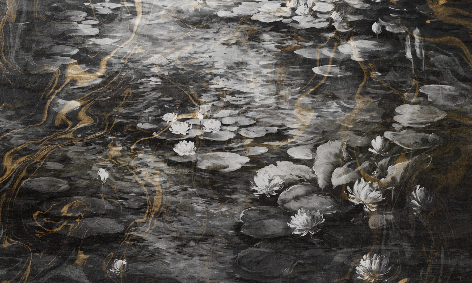Czarno-biała tapeta z motywem lilii na tafli jeziora. Subtelna, artystyczna kompozycja tworzy spokojny, elegancki klimat.