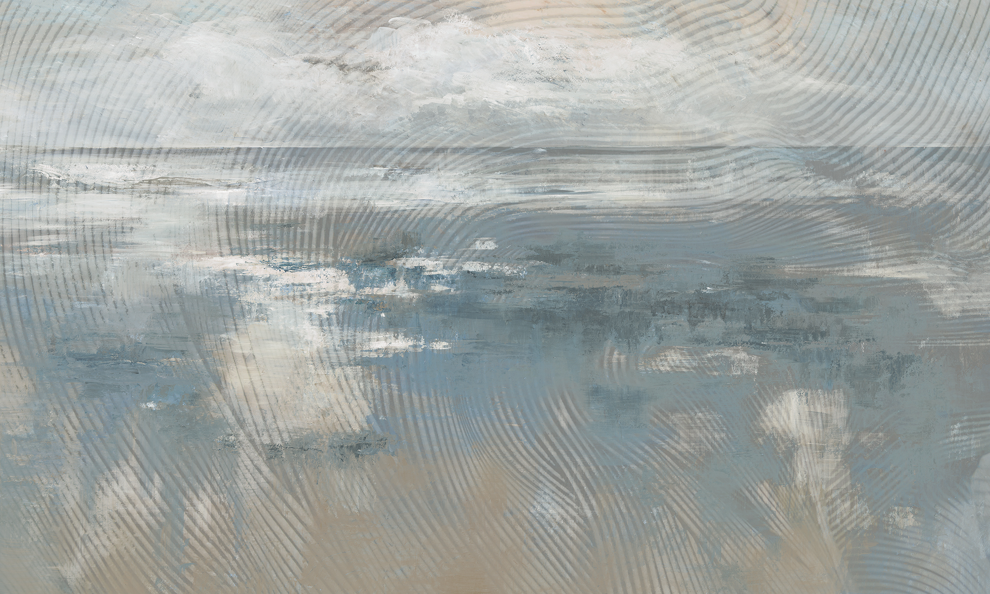 Lekki pejzaż w odcieniach błękitu i piasku. Malarstwo inspirowane wodą i światłem, wprowadzające do wnętrza świeżość i harmonię.