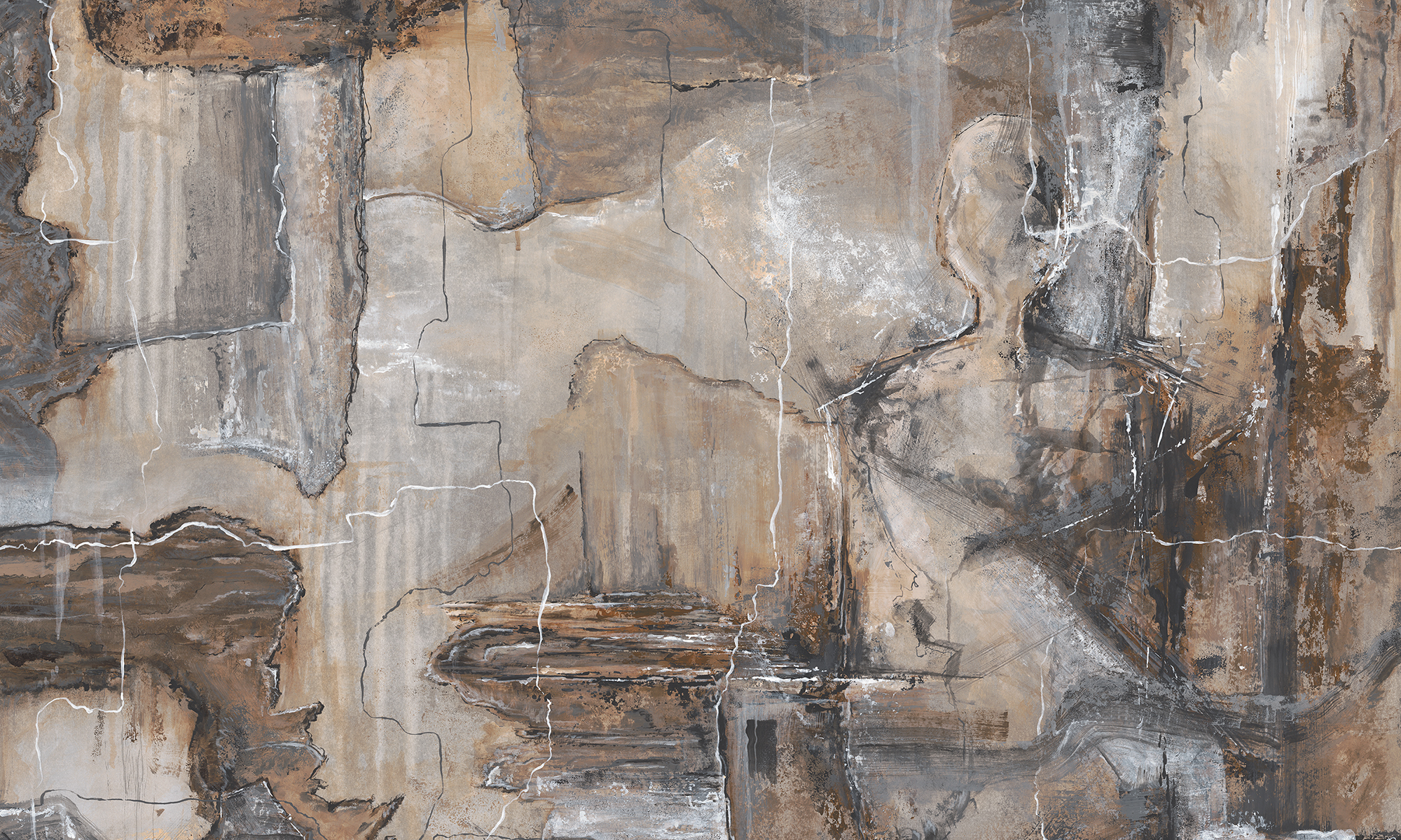 Odcienie piasku i ochry tworzą efekt spękanej skały. Naturalna paleta barw łączy się z rysunkiem, tworząc wrażenie głębi i miękkości formy.