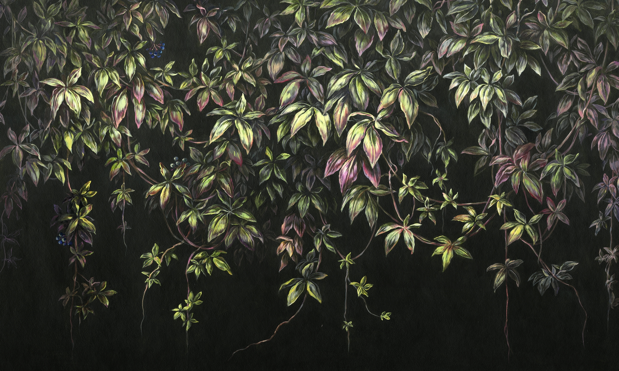 Elegancka tapeta ścienna z motywem bujnych, zielonych liści na ciemnym tle. Stylowa dekoracja wnętrz, która wprowadza naturalny klimat i głębię, tworząc efekt zielonej oazy w domu.