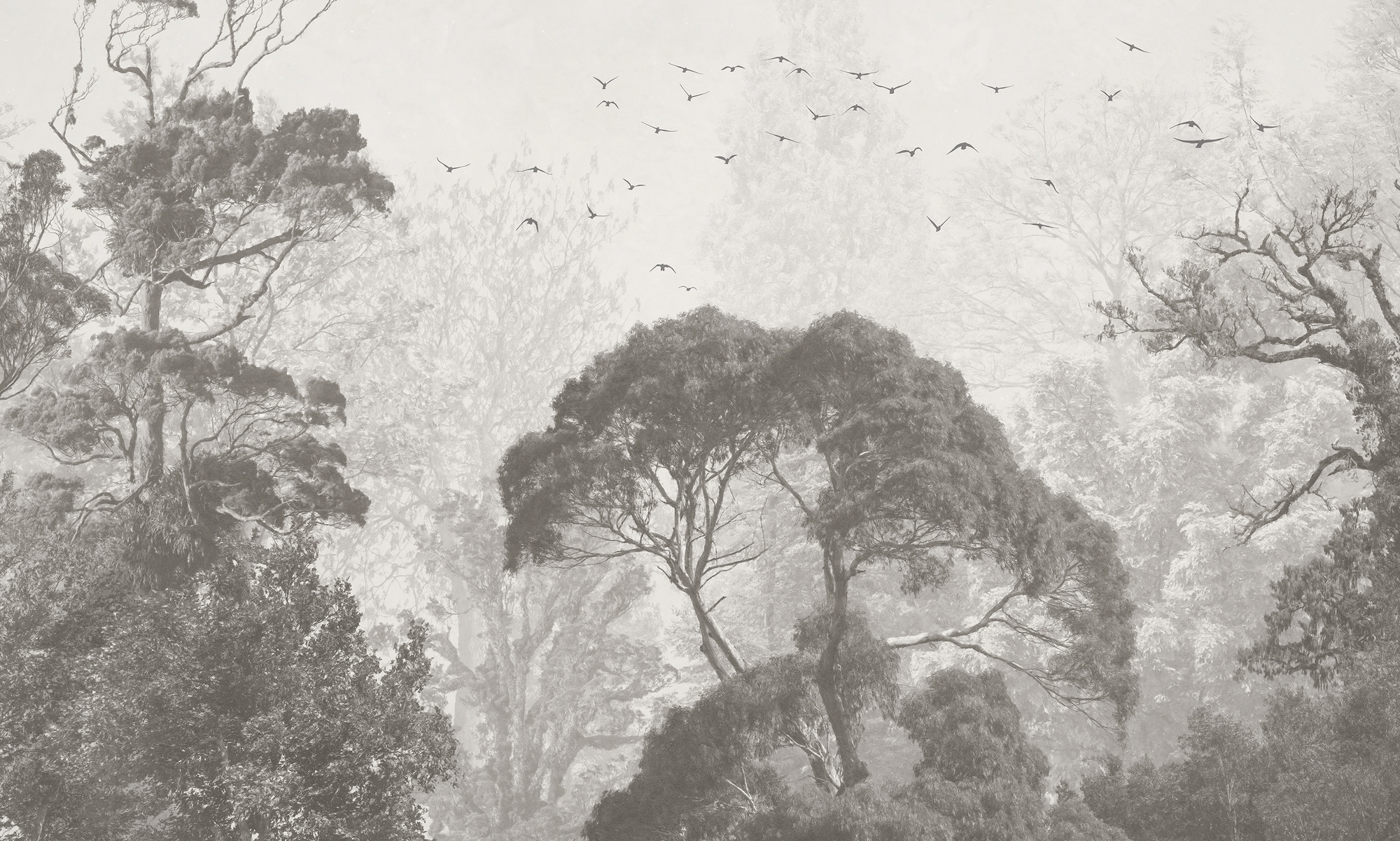 Subtelna tapeta ścienna z motywem lasu i lecących ptaków w delikatnych odcieniach szarości. Elegancka dekoracja wnętrz, która wprowadza spokój, harmonię i naturalny klimat.