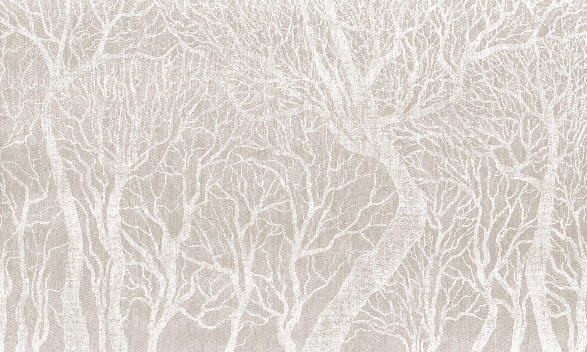 Tapeta z delikatnym motywem drzew o ażurowych koronach. Jasna, tonowana paleta barw tworzy spokojne tło, idealne do wnętrz w stylu skandynawskim lub japandi.