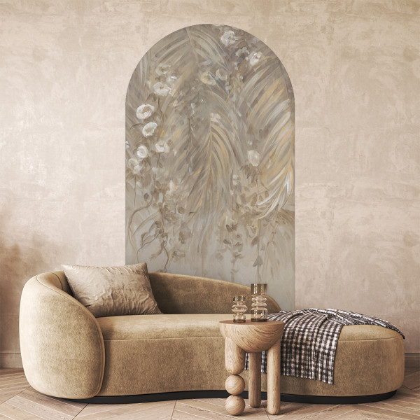 Łuki dostępne są w jednym standardowym rozmiarze: 130 × 250 cm. Drukujemy je na samoprzylepnym podkładzie o strukturze płótna, dzięki czemu montaż jest szybki i prosty – wystarczy odkleić folię zabezpieczającą i przykleić dekorację bezpośrednio na ścianę.