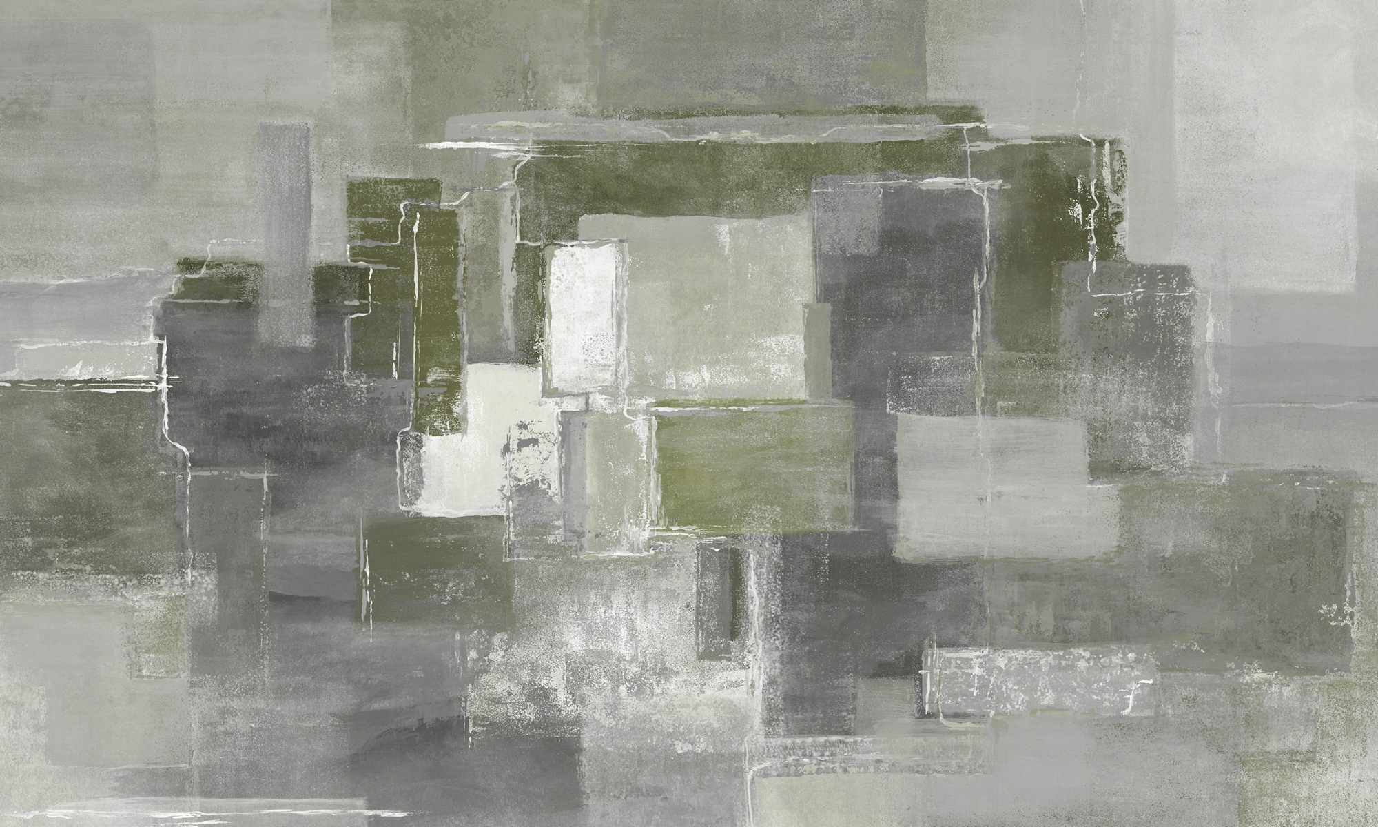 Nowoczesna geometria w tonacji oliwkowo-szarej. Delikatne przejścia kolorów i przetarcia budują efekt głębi i miękkiej struktury.