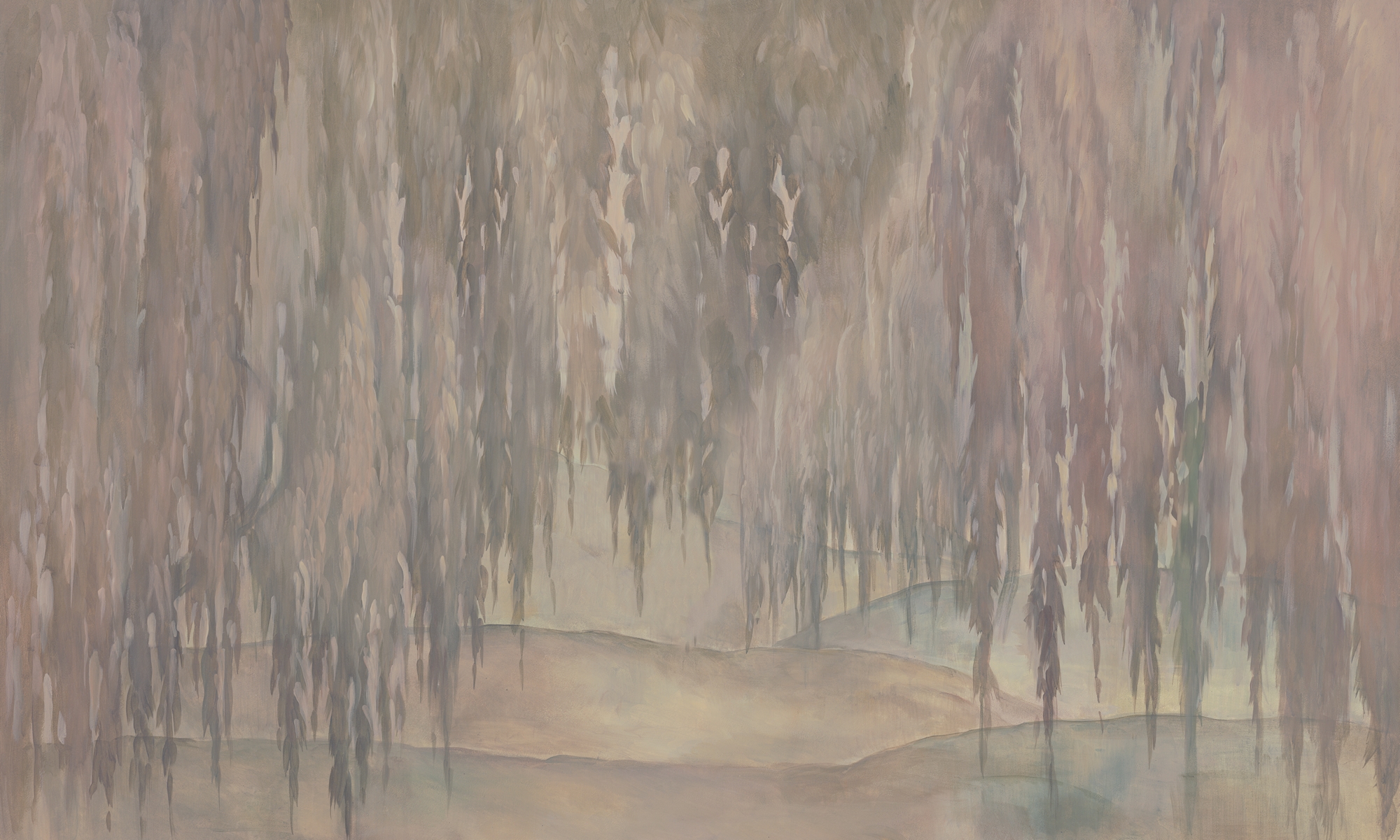 Tapeta ścienna w pastelowych odcieniach różu, beżu i szarości. Miękkie, pionowe formy inspirowane gałązkami wierzby tworzą delikatną, kojącą kompozycję o malarskim charakterze.