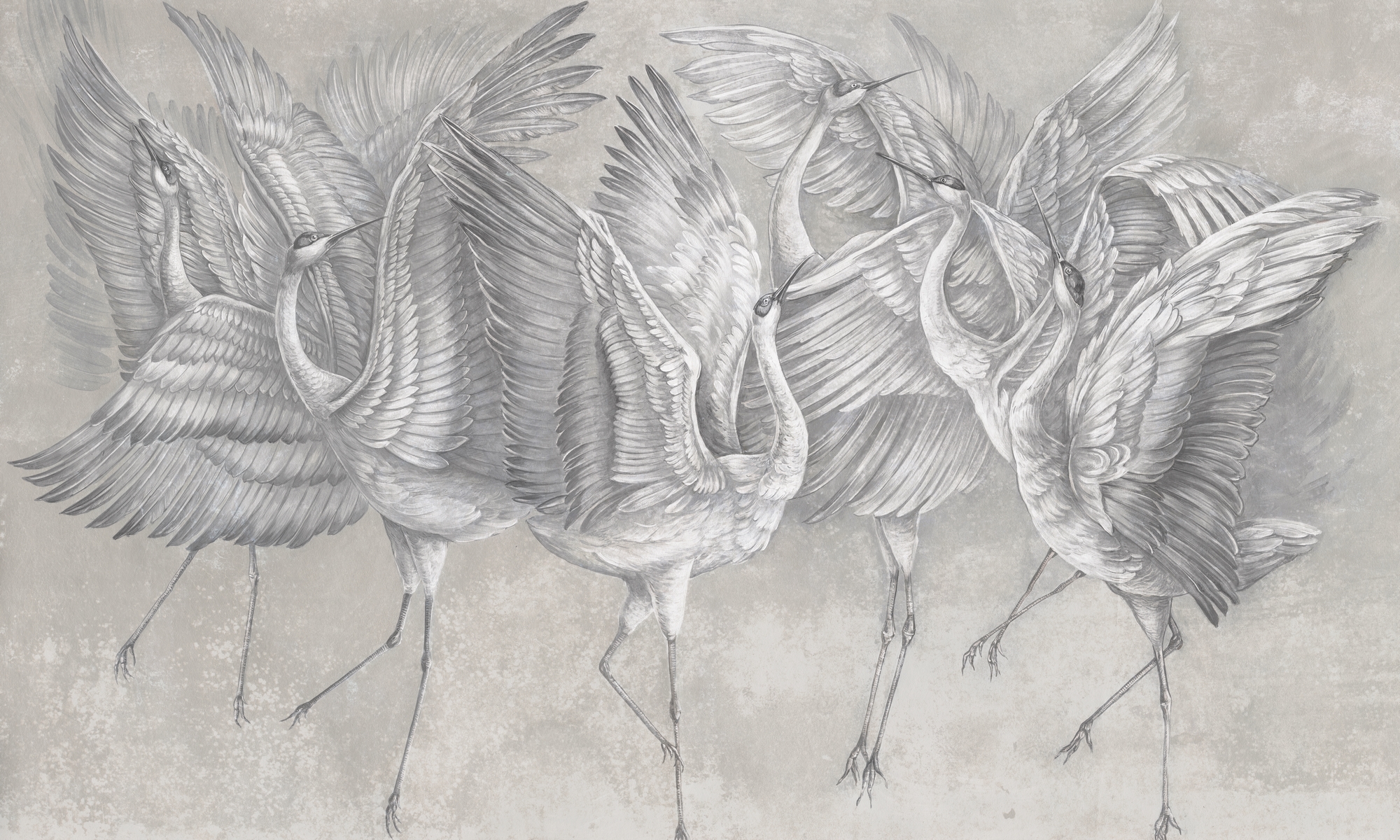 Tapeta w tonacji szaro-beżowej, inspirowana ruchem skrzydeł. Delikatna faktura i naturalne światło nadają wnętrzu spokoju i przestronności.