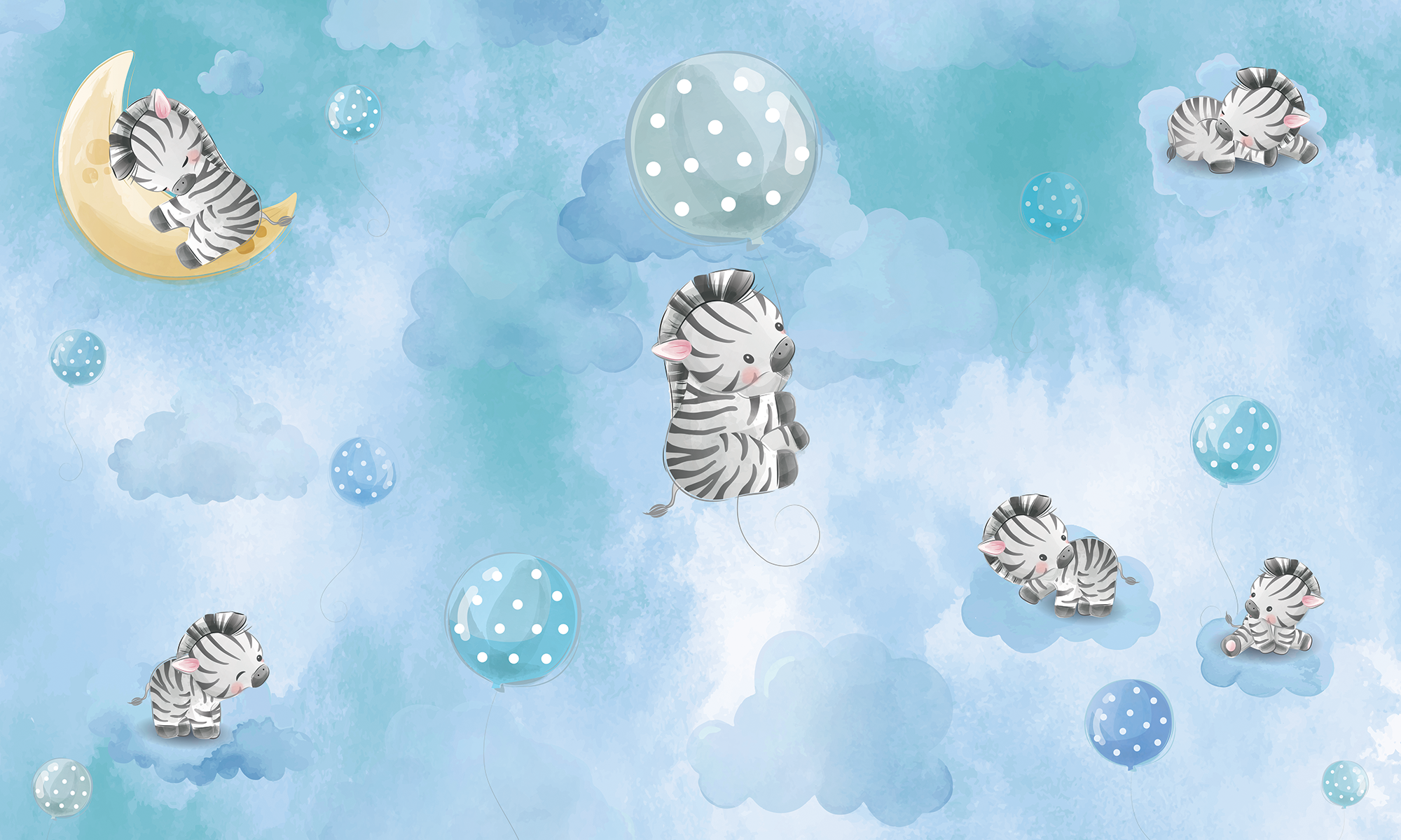 Zebra Sky to tapeta dziecięca z ilustracyjnym motywem uroczych zeberek unoszących się na tle chmur i nieba. Delikatny, powtarzalny wzór w pastelowych odcieniach błękitu tworzy spokojną i harmonijną przestrzeń, idealną do pokoju dziecka.
